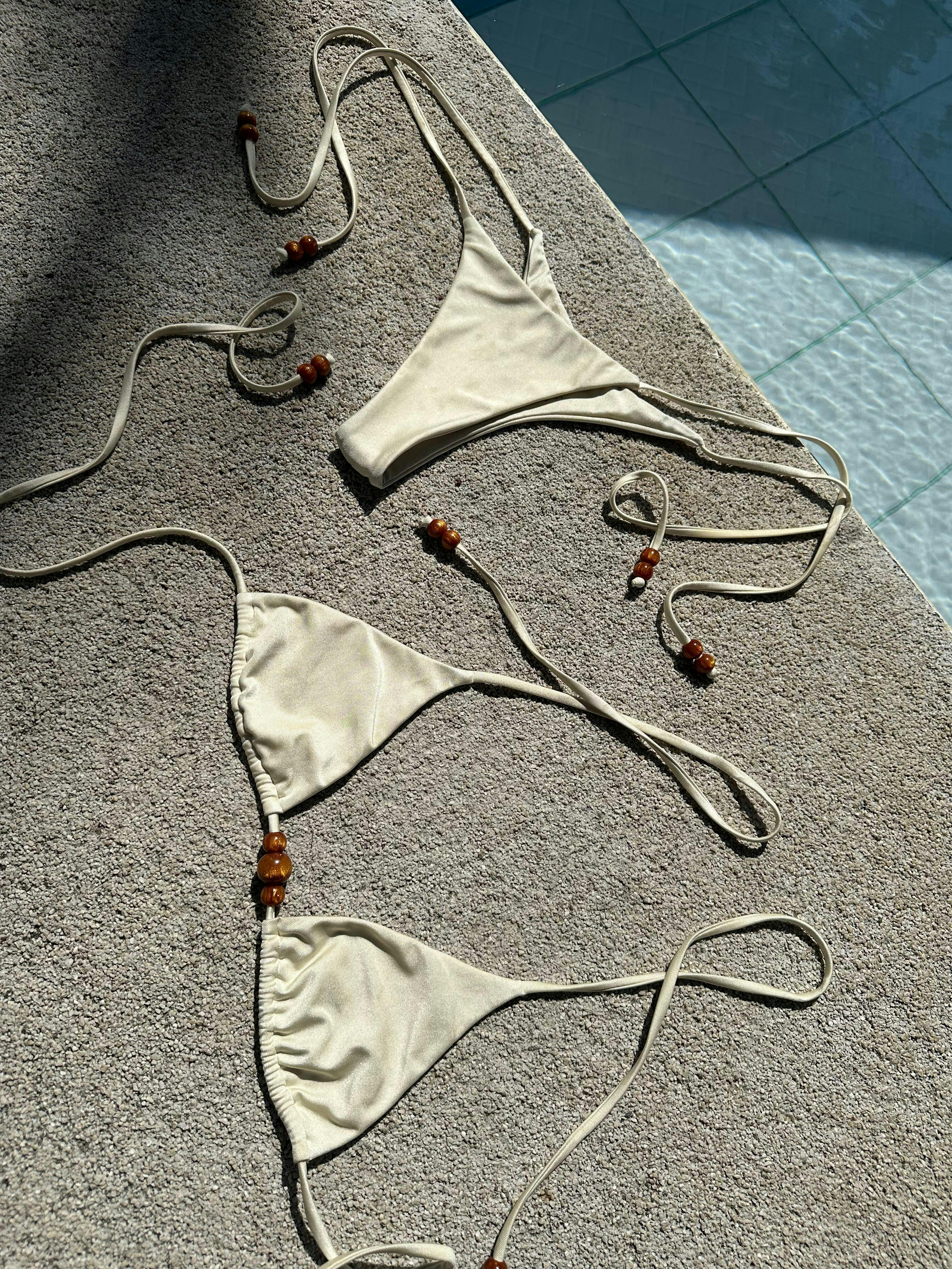 Embody elegance with our Violet Shore Bikini Bottom, designed in a shimmering ivory fabric that catches the light beautifully. Delicate purple bead accents add a refined touch, elevating this classic style to new heights.